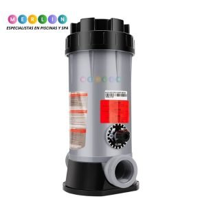– Principio de funcionamiento: se depositan las pastillas de cloro en el distribuidor, el agua sube en el dosificador y se mezcla, para ser posteriormente inyectada en el circuito de filtración de la piscina.