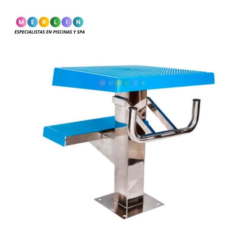 Plataformas de partida de dos pasos para piscinas olímpicas y semi-olímpicas, fabricadas en acero inoxidable de la más alta calidad, fuertes y duraderas. La plataforma está fabricada con resina epóxica y es de superficie antideslizante. Las piezas de la plataforma pueden ser ajustadas hacia atrás o hacia adelante en función de la alineación.